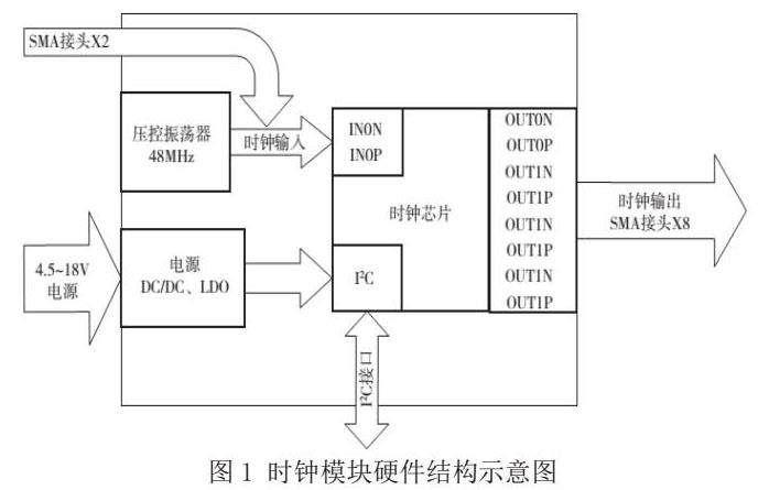研究针对时钟模块设计了单独的单板,以便为多个芯片提供时钟,其硬件结构如图1所示。时钟模块包含了4个外部接口,对应PS、PL、MGT以及DDR 4部分时钟信号,将Si5340多种输出驱动配置的时钟芯片作为时钟发生器的芯片,配备的有源振荡器为48MHz,独立低抖动,输出频率及驱动配置均能够利用相关软件进行灵活设计。