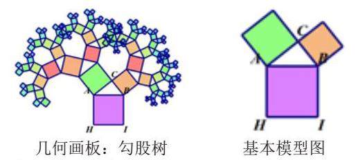 利用几何画板制作精美的“勾股树”动画在课前播放,让学生感受勾股定理蕴藏的数学之美,激发学生对本节课内容探讨的积极性。通过静止画面,学生进一步观察发现组成勾股树的基本模型图,引出本节课讨论内容。发现过程遵循了学生的客观认知过程,由学生自主完成的。