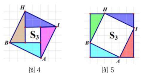 学生4:(其他小组代表上实物投影展示)可以用“补”的方法。还是以图1中的S3为例,在这个“不友好”的正方形外面利用网格线补出一个新的大正方形(如图5)。此时S3等于新的大正方程面积减去周围四只全等的直角三角形面积,也可以得到S3=20。