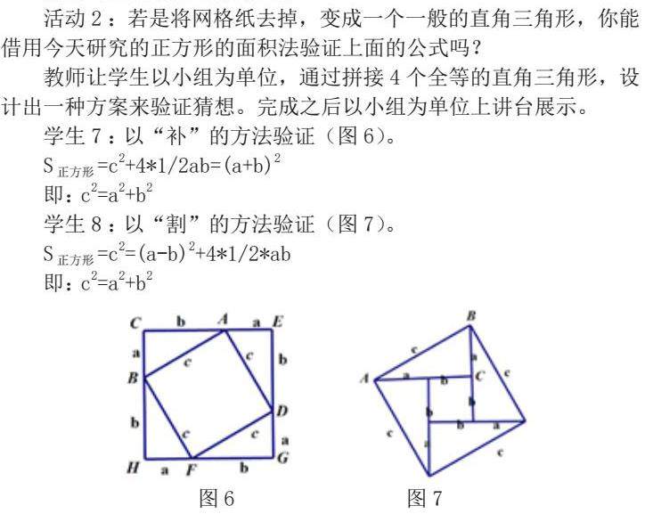 在本堂探究课中设计了两处小组合作,分别在定理的猜想和验证环节。定理的猜想是通过分别计算3张放置在网格图中的模型图中,不同的正方形面积得到的。由于学生学习能力的差异,并不是班级所有学生都能得到正确结论。通过小组合作,学生能在组内交流中互相学习,发现最优解法,也能及时发现计算失误,避免由计算失误而影响到对定理的猜想。在验证环节,每个人手中只有一张直角三角形卡片,小组合作拼接的目的一是节省时间,二也是为了渗透合作意识。