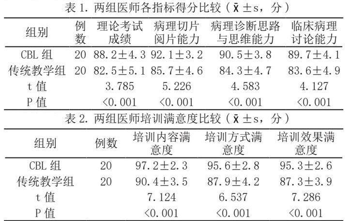 在培训满意度调查中,CBL组的满意度评分明显高于传统教学组,差异有统计学意义(P<0.05),如表2所示。