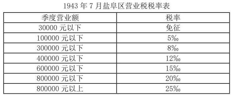 2、营业税。以应用收入额或收益额为课税对象,所有从事营业的单位或个人都是纳税义务人。1940年10月,盐阜区抗日根据地依照原有规定开征营业税,税率初为8‰,按季征收,季度营业额不满1000元(抗币)免征,乡村流动商贩、作坊季度营业额在2000元亦给予免征照顾。1943年8月20日,盐阜区工商局颁布《营业税征收章程》,全区统一按累进税率征收,最高为25‰、最低5‰。