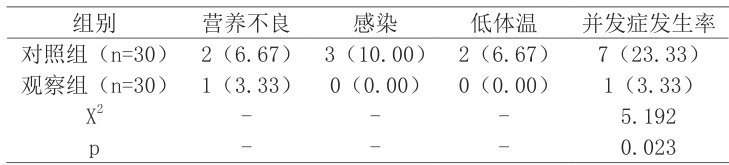 1.3.1 并发症发生率:观察在研究展开过程中,早产儿出现感染、营养不良、低体温的具体情况。