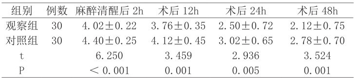视觉模拟评分量表(VAS)评价麻醉清醒后2h 与术后不同时间段的疼痛感,0-10 分,评分越高,疼痛感越显著。