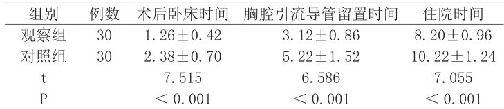 对比两组术后卧床时间、胸腔引导管留置时间、住院时间。