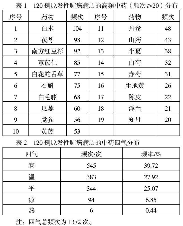 对120例肺癌患者处方用药进行统计,处方共涉及155味中药,共1690药次,频次≥20的中药有19味,从高到低分别为白术、茯苓、南方红豆杉、薏苡仁、白花蛇舌草等。详见表1。
