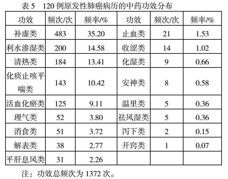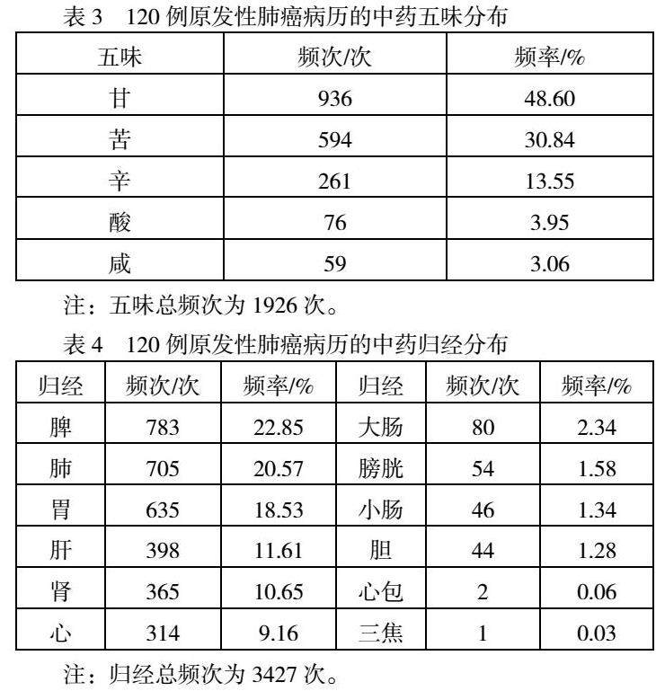 从数据挖掘结果来看,贾教授治疗肺癌用药讲究寒热平调,甘味药物使用最多,苦、辛味次之,脾、肺、胃三经用药频率最高,功效以补虚类药物、利水渗湿类药物、清热类药物为主。