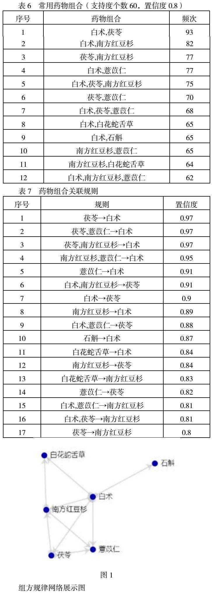 设置“支持度个数”为60,“置信度”为0.8,获取12条常用药物组合,药物组合出现频数从高到低分别为白术-茯苓,白术-南方红豆杉,茯苓-南方红豆杉,白术-薏苡仁,白术-茯苓-南方红豆杉等,详见表6;对所得药物进行规则分析,结果见表7,按照药物组合,得出组方规律的网络展示图,见图1。