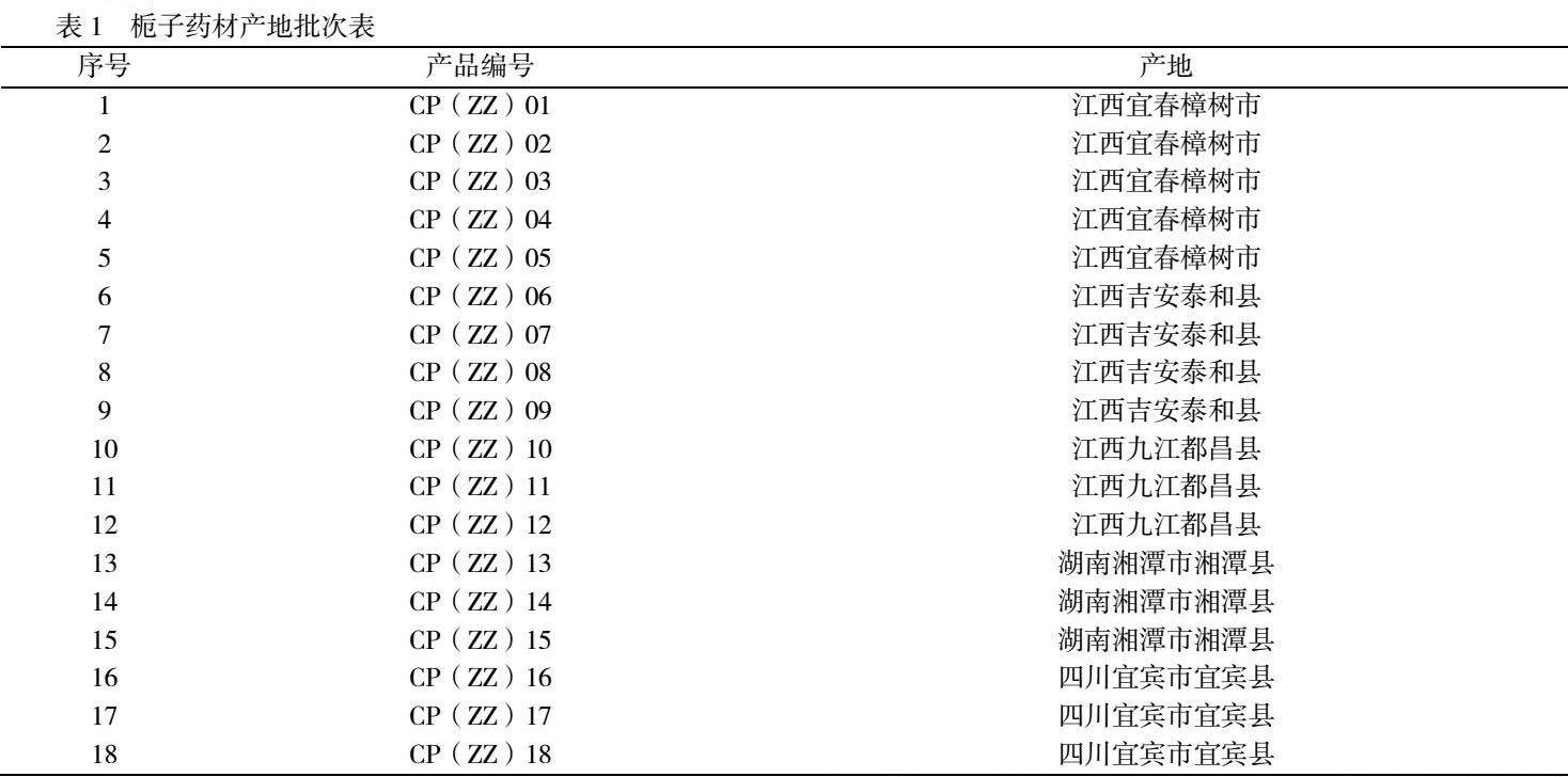 本研究从江西、湖南、及四川等产地收集了18批栀子药材并碾碎成为饮片。18批栀子饮片信息如表1所示,编号为CP(ZZ)01 ~ CP(ZZ)18。经鉴定,均为茜草科植物栀子Gardenia jasminoides Ellis的干燥成熟果实。