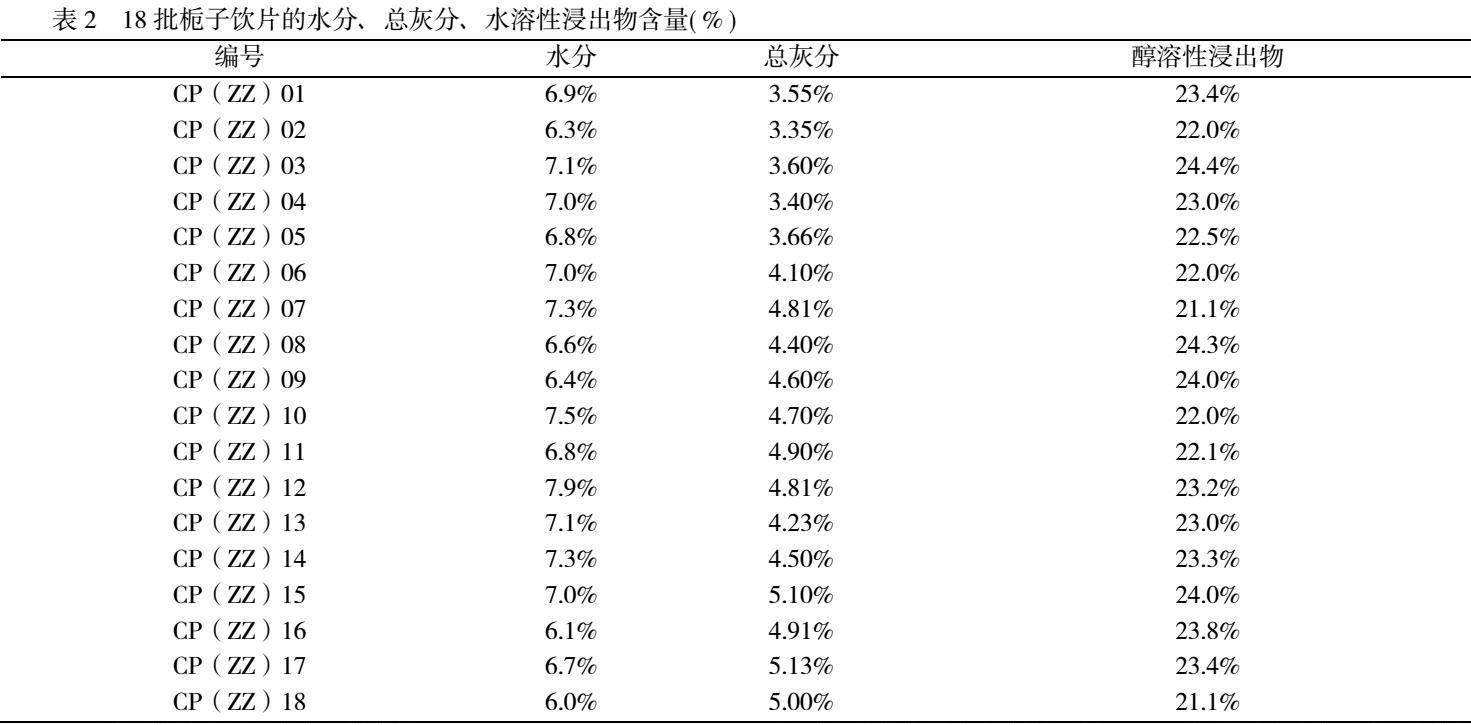 按照2020年版《中国药典》 (四部) 中规定方法(分别为通则0832、通则2302、通则2201) ,对18批栀子饮片的水分、总灰分以及醇溶性浸出物进行测定,结果见表2。18批栀子饮片的水分测定结果为6.0%~7.9%,总灰分测定结果为3.35%~5.13%,醇溶性浸出物测定结果为21.1%~24.3%。以上项目检查均符合 2020年版《中国药典》(一部) 对栀子饮片的规定。