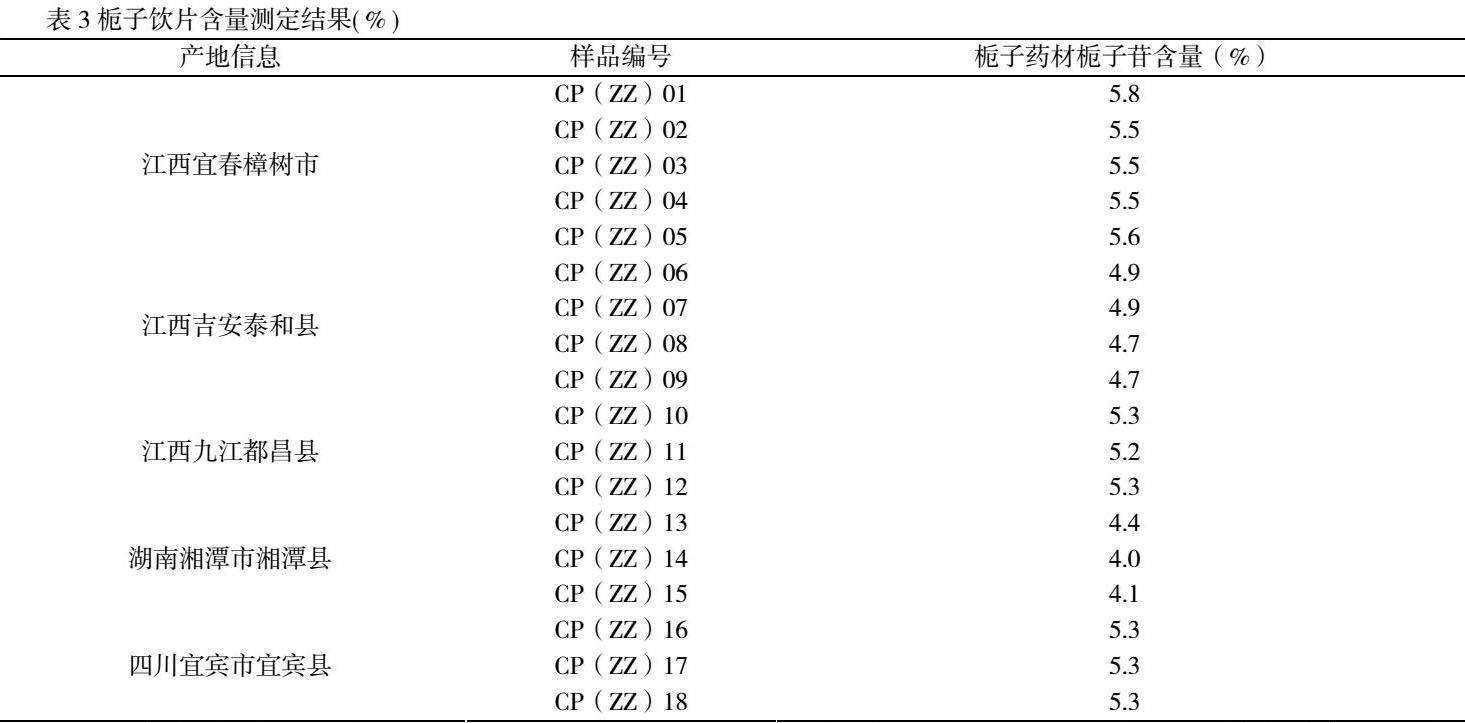 按照《中国药典》(2020版)(一部)中栀子饮片,【含量测定】项下方法进行测定,结果见下表3。18批栀子饮片中,栀子苷的最低值为4.0%,最高值为5.8%。18批栀子饮片中含量测定结果,说明这18批栀子饮片在栀子苷的含量方面是符合药典标准的,即栀子苷(C17H24O10)不得少于1.8% 。