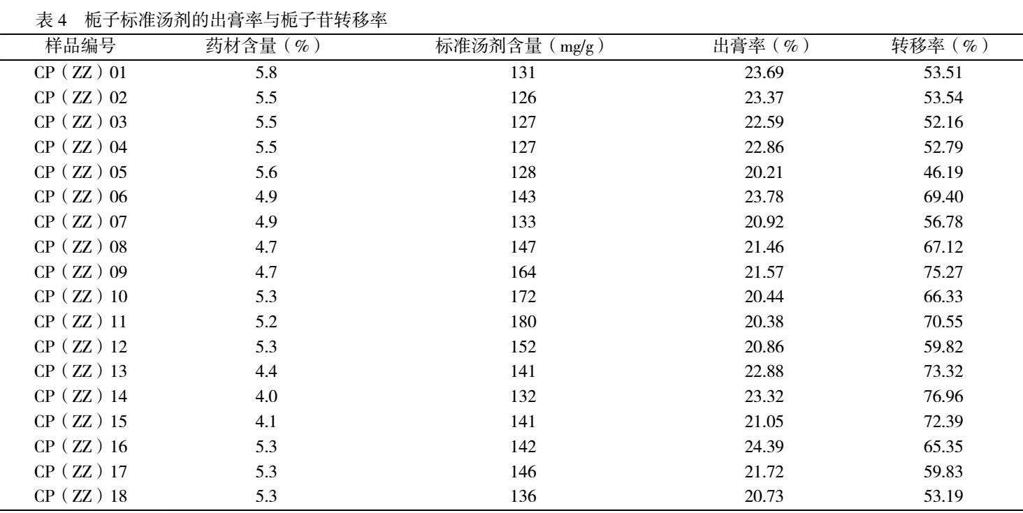 转移率%= 标准汤剂中栀子苷含量×标准汤剂出膏率 ×100