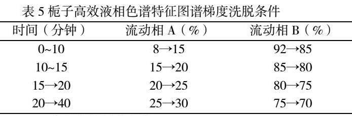 色谱柱:C18 Superb 5μm 4.6×250mm,以乙腈为流动相A,以0.4%磷酸溶液为流动相B,按照下面梯度表进行洗脱,梯度洗脱条件见表5,后运行10min再进下一针;检测波长:0~23分钟为238nm,23~40分钟为440nm。理论板数按栀子苷峰计算应不低于3000。