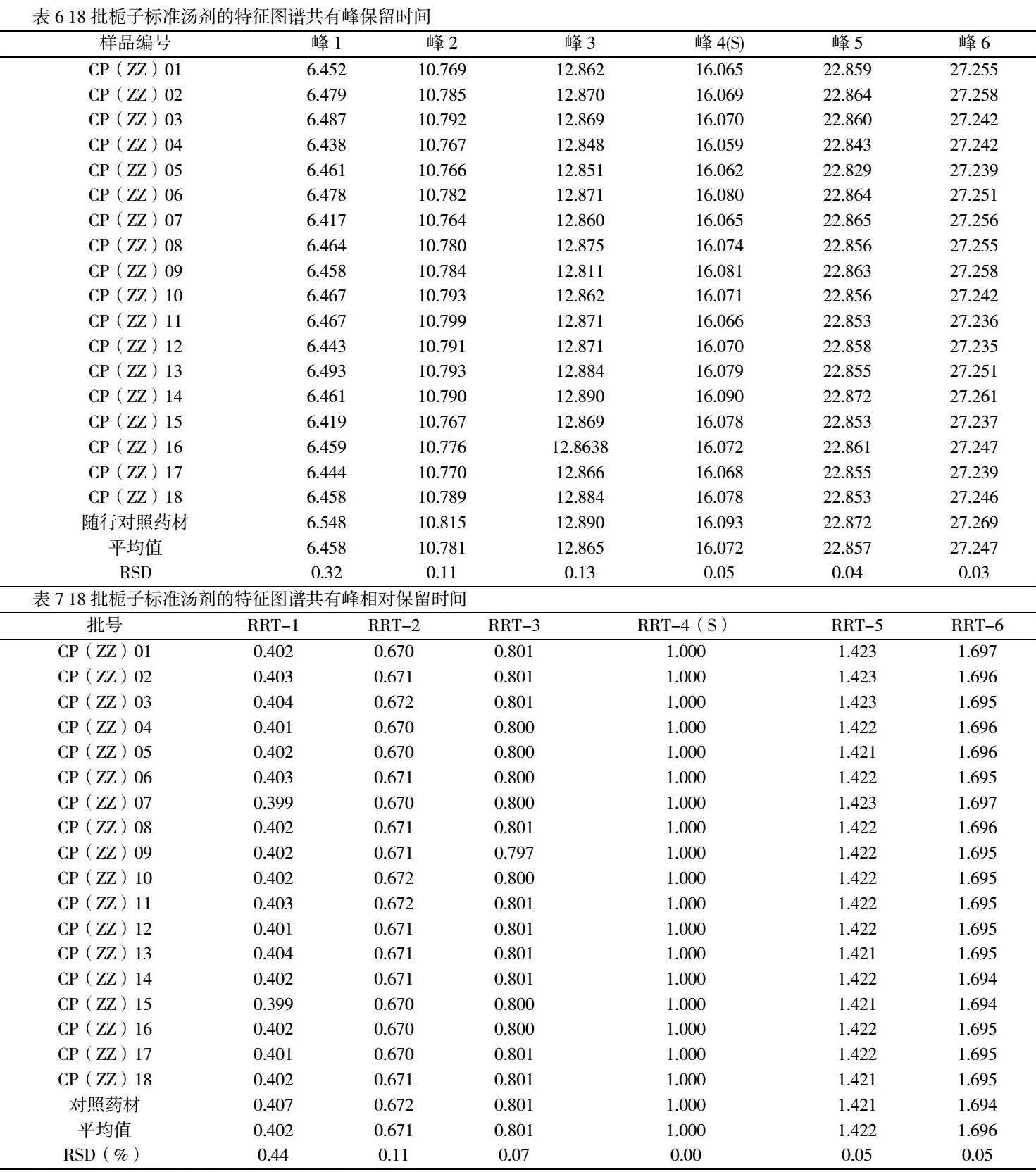 选取((CP(ZZ)01) 供试品溶液,依据“2.6.3”项下平行制备供试品溶液6次,依据 “2.6.1”项下色谱条件进样,计算所有共有峰的相对保留时间及相对峰面积。结果显示各共有峰的保留时间的RSD均小于0.11% ,峰面积的RSD均小于0.81% ,表明该方法重复性良好,见图2。