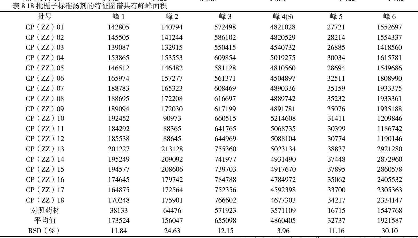 选取((CP(ZZ)01) 供试品溶液,依据“2.6.1”项下色谱条件连续进样6次,计算所有特征峰的保留时间、峰面积。结果显示各特征峰的保留时间的RSD≤0.10% ,峰面积的RSD ≤1.20% ,表明该仪器精密度良好,见图1。