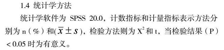 统计学软件为SPSS 20.0,计数指标和计量指标表示方法分别为n(%)和( ),检验方法则为X2和t,当检验结果(P)<0.05时为有意义。