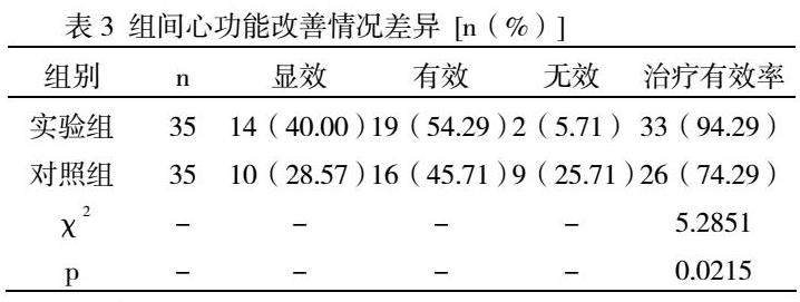 实验组患者的心功能改善有效率要明显高于对照组(P<0.05),见表3。