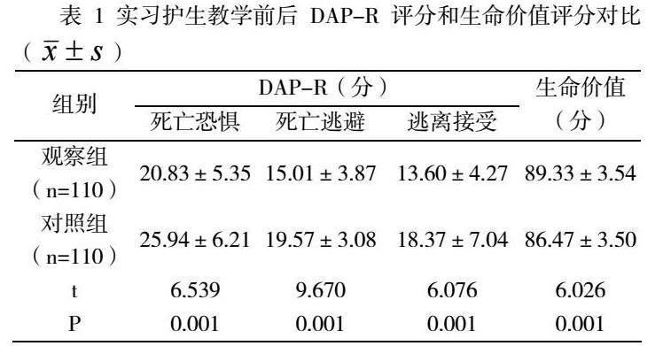 教学后实习护生DAP-R死亡态度评分低于教学前,生命价值评分均高于教学前,差异均有统计学意义(P<0.05),如表1: