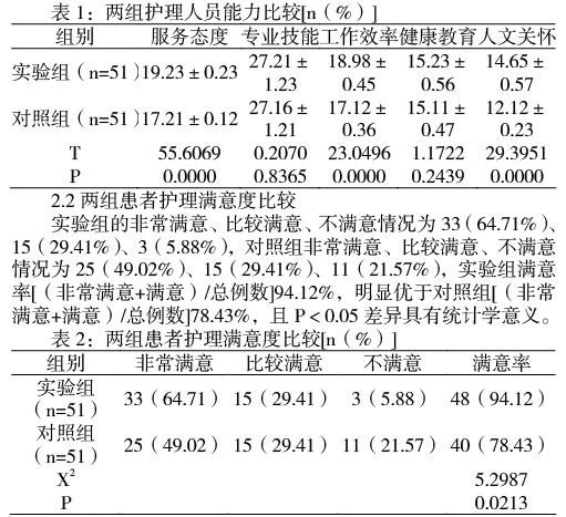 实验组在服务态度、工作效率、人文关怀等方面的能力评分为19.23±0.23、18.98±0.45、14.65±0.57,明显优于对照组在服务态度、工作效率、人文关怀等方面的能力评分17.21±0.12、17.12±0.36、12.12±0.23,且P<0.05差异具有统计学意义;实验组在专业技能、健康教育等方面的评分为27.21±1.23、15.23±0.56与对照组在专业技能、健康教育等方面的评分27.16±1.21、15.11±0.47,无明显差异,不具统计学意义。