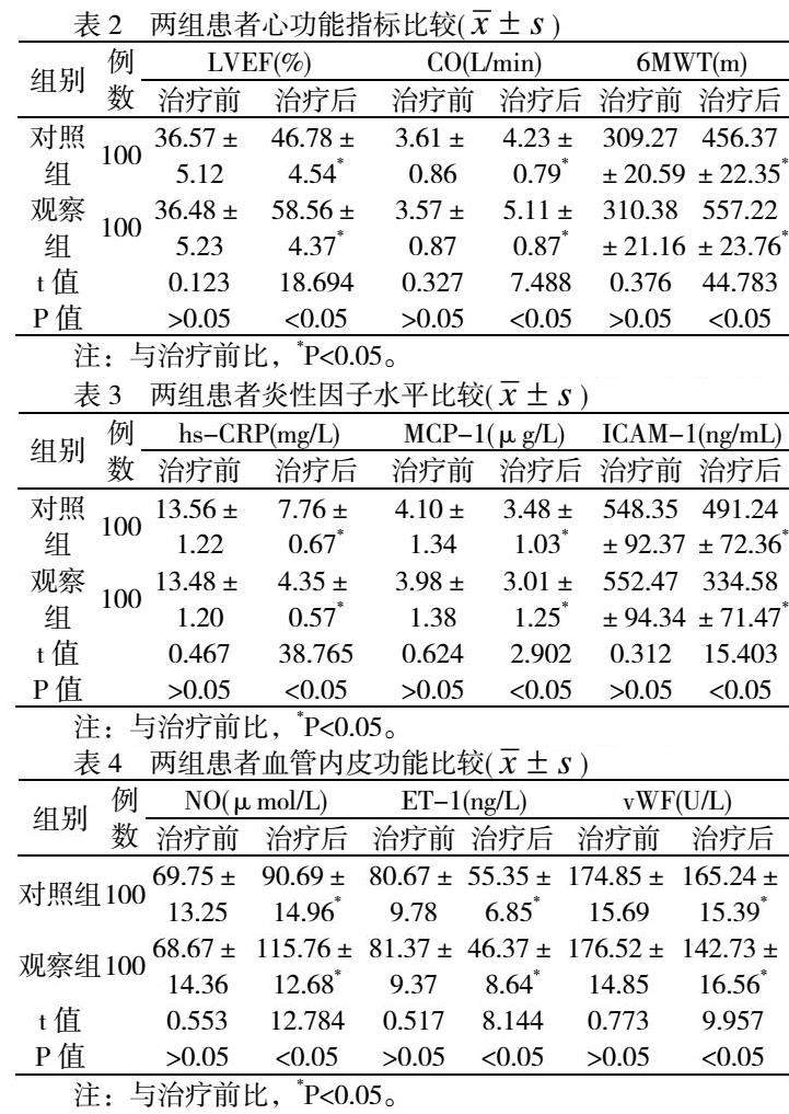 2.2 两组患者心功能指标比较 相较于治疗前,治疗后两组LVEF、CO水平均升高,且观察组较之对照组更高(P<0.05);相较于治疗前,治疗后两组6MWT距离均延长,且观察组较之对照组更长(P<0.05);见表2。