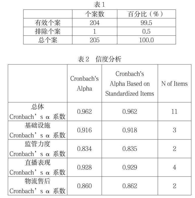 本次研究采取网络发放问卷的方式进行收集数据,分析在电商直播的模式下各因素对消费者满意度的影响,问题分为两个部分,首先是对消费者基本信息的了解,包括性别、年龄、学历、月收入这几个部分;然后对上述因素进行了测量,在评判标度上采用李克特5点量表法,对非常满意、满意、一般、不满意和非常不满意依次赋予5、4、3、2、1的分值。共发放问卷205份,有效问卷204份(表1),并通过SPSS进行了信度分析(表2)可以得到总体的α值是大于0.80,所以统计表可用,且0.962>0.90,说明该结果十分可信,说明此问卷量表总体的可靠性较高。从各维度来看,每一维度的Cronbach’s α系数均大于0.80,说明各变量也具有良好的内部一致性。