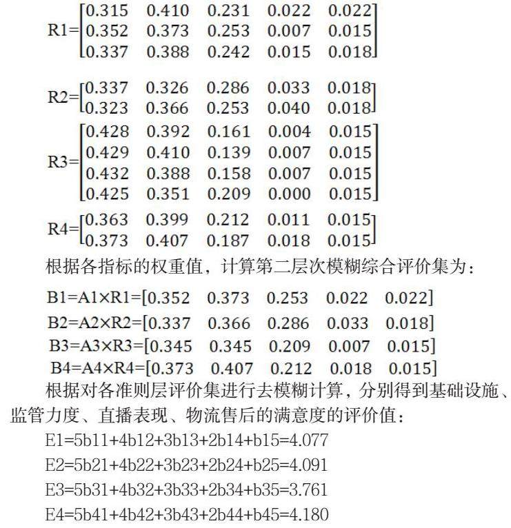 首先,建立评价集G=(G1,G2,G3,G4,G5)=(非常满意,满意,一般,不满意,非常不满意);消费者满意度评价指标集U,U=(Ui)(i=1,2,3,4分别是基础设施、监管力度、直播表现、物流售后4个准则层),其中每个Ui均由下一级指标Uij组成。其次,对消费者满意度调查问卷进行数据汇总,得出每个因子Uij隶属于评价集G的人数占问卷参与者总数的百分比,即Ri,i=1,2,3,4,5表示该因子消费者满意度由高到低的占比。然后利用模糊综合评价法计算出基础设施、监管力度、直播表现、物流售后等4项准则层消费者满意度的评价矩阵: