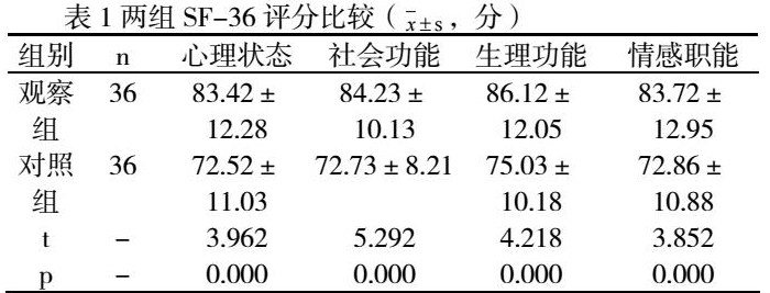 干预后,观察组患者的SF-36评分高于对照组(P<0.05)。见表1.