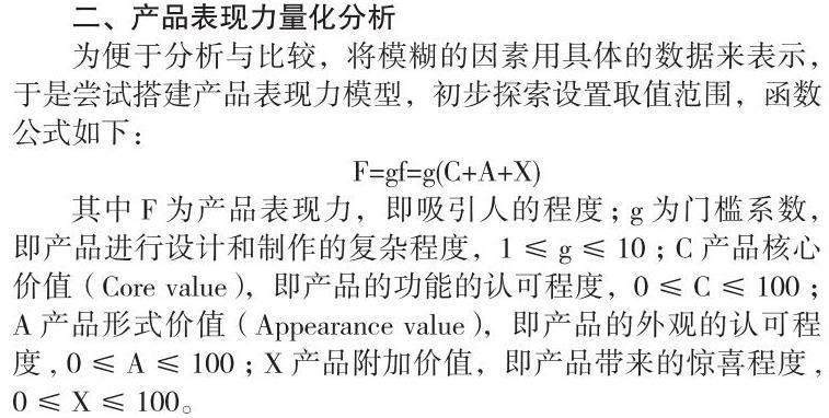 为便于分析与比较,将模糊的因素用具体的数据来表示,于是尝试搭建产品表现力模型,初步探索设置取值范围,函数公式如下: