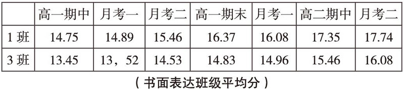 笔者通过改变写作课教学模式和评价方式,挖掘学生的潜能,进行多维度的写作训练等一系列教学实践活动激发学生的写作积极性。经过近一年的实验研究,通过调查研究法(包括问卷法和谈话法)、观察研究法和前后前测后测对比研究(学生期中期末写作部分得分情况数值比对)等方法进行研究。笔者将高一年级1.3两个班的期中、期末、阶段性考试(共七次)中书面表达题的得分情况进行了汇总统计和分析,数据显示情况如下表: