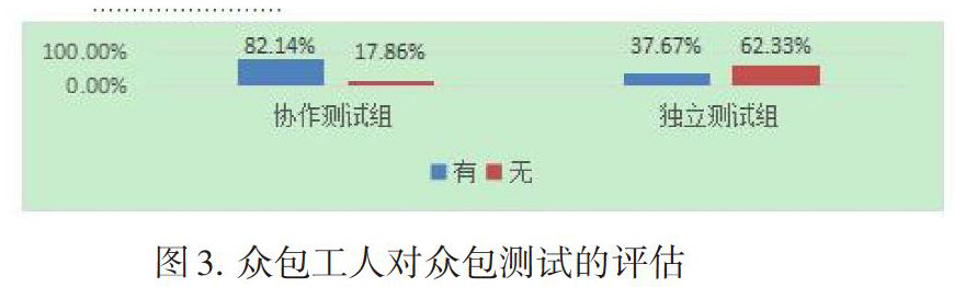 图2和图3分别为问题Q1和Q2的调查结果统计。分析上述结果,我们知道虽然只有10.71%的学生一点都不想参加到众包测试当中去,但高达64.29%的学生对众包测试有一定兴趣。也就是说,绝大多数众包工人以积极态度参与此次众包测试,此次的实验结果对于我们分析不同机制下的测试效率差异是有价值的。从众包工人对众包测试的评估结果来看,协作测试组中认为众包测试对自身测试能力的提高有帮助的人数远远多于独立测试组的人数,独立测试组的多数众包工人(62.33%)认为众包测试对自己是毫无帮助的。结合上文提到的社会心理理论,群体社会中的个体在能力更高的同伴、成人或工具的帮助下自身的认知潜力将被很大程度的挖掘出来,即能力获得提升,这与协作测试组众包工人认为众包测试是有帮助的是相通的。综上所述,众包工人间的相互协作对于每个众包工人的认知发展和知识获得至关重要。