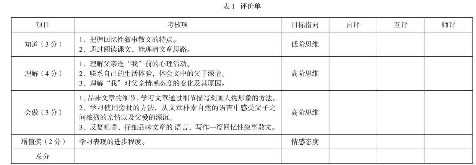 我们教学散文《背影》时采用多元评价,强调评价主体和内容的多元化;重视增值评价,关注学生个人进步的幅度,激发学生的兴趣和积极性。针对以《背景》为例的回忆性叙事散文教学,我们设计了如下评价单。详见表1.