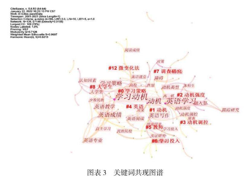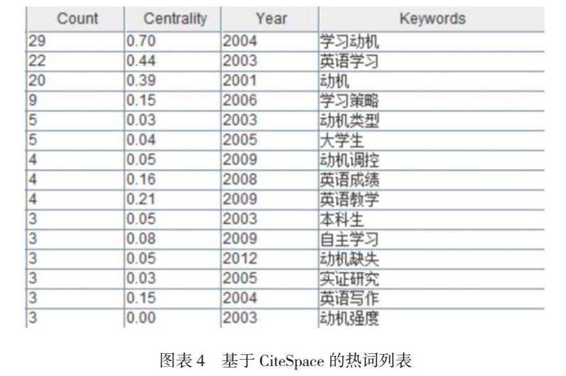 通过关键词,可以看出文献所要表达的核心主题与主要内容。所以通过关键词词频变化及其中介中心性分析大学生英语学习动机的相关研究重点,我们可以揭示研究热点之间的突变或转化关系。本研究通过CiteSpace.5.8.R3从103篇核心期刊和CSSCI期刊文献中提取关键词,对相关文献进行分析并得到由关键词组成的研究热点知识图谱(见图表3)。