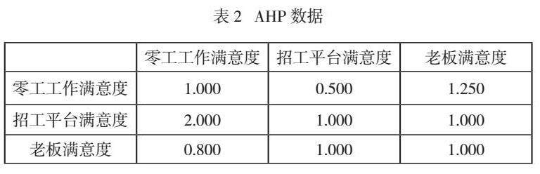 零工就业群体满意度的综合评价受多因素的影响,部分因素产生的影响大,部分因素对满意度的影响小,因无法综合衡量各因素的影响程度,需采用一定方法对含有多个目标和多个因素的复杂问题进行分层处理,从而确定各层次的影响程度。AHP层次分析法能够有效的优化层次结构,对各层次进行定量描述,使得评价过程更加啊合理化、科学化,因此该方法适用于对零工就业群体满意度分析的研究。