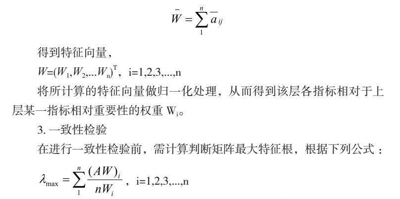 在构造判断矩阵之后,使用和积法计算方法进行AHP层次分析法研究,得出目标层A中个元素的权重。