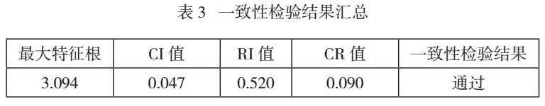 于0.1,则判断矩阵满足一致性检验;如果CR值大于0.1,则说明不具有一致性,应该对判断矩阵进行适当调整之后再次进行分析。本次针对3阶判断矩阵计算得到CI值为0.047,针对RI值查表为0.520,因此计算得到CR值为0.090<0.1,意味着本次研究判断矩阵满足一致性检验,计算所得权重具有一致性。