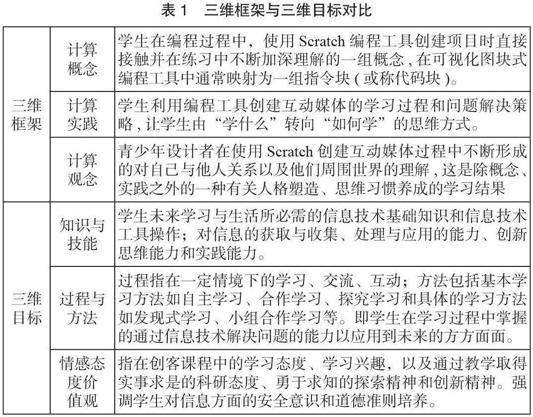 计算思维三维框架与我国教师所熟知的中小学信息技术三维目标即知识与技能、过程与方法和情感态度价值观相呼应。比较计算思维三维框架和中小学创客课程三维目标的共同之处如表1所示,在学习目标上加深两者之间的联系。