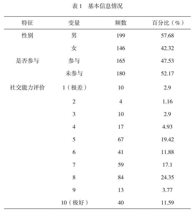 整理数据得出,被调查对象的基本信息为(见表1),总样本数为345份,其中男生199人,女生146人;参加了团体辅导的人数为165人,未参加团体辅导的人数为180人;被调查者人际沟通能力总分最小值是1分,最大值是10分。数据显示被调查者对自身人际交往能力的认知超过中等水平(>5分)的为68.69%,有11.59%的学生认为自身的人际沟通能力极好(10分),仅有2.9%的学生认为自身的人际交往能力极差(1分)。表明学生自身认知与实际表现还存在一定差距,需要引导学生在日常的人际交往中,做到正确认识与接纳真实的自我。