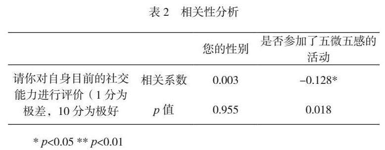 对被调查者的社交能力评价与性别、是否参加团辅活动进行相关性分析,使用Pearson相关系数来表示相关关系的强弱情况,从表2中得知:学生的性别和对自身目前的社交能力进行评价(1分为极差,10分为极好)之间的相关系数值为0.003,接近于0,并且p值为0.955>0.05,因而说明性别和对自身目前的社交能力进行评价(1分为极差,10分为极好)之间并没有相关关系。而学生是否参加了五微五感的活动和对自身目前的社交能力进行评价(1分为极差,10分为极好)之间的相关系数值为-0.128,并且呈现出0.05水平的显著性,因而说明是否参加了五微五感的活动和对自身目前的社交能力进行评价(1分为极差,10分)为极好之间有着显著的负相关关系。说明在与实际情况的对比中,参加完五微五感心理团体辅导活动的学生对自身的人际沟通能力更有准确的的认知评价。