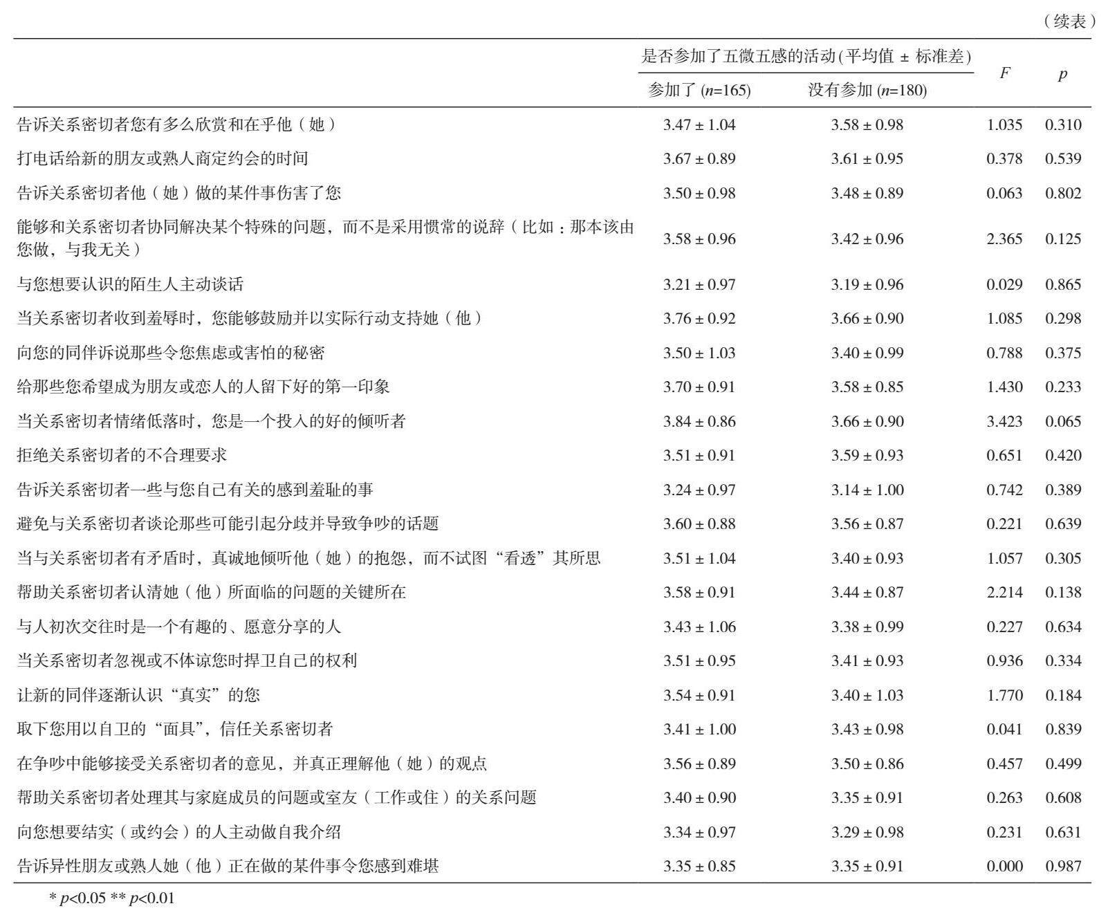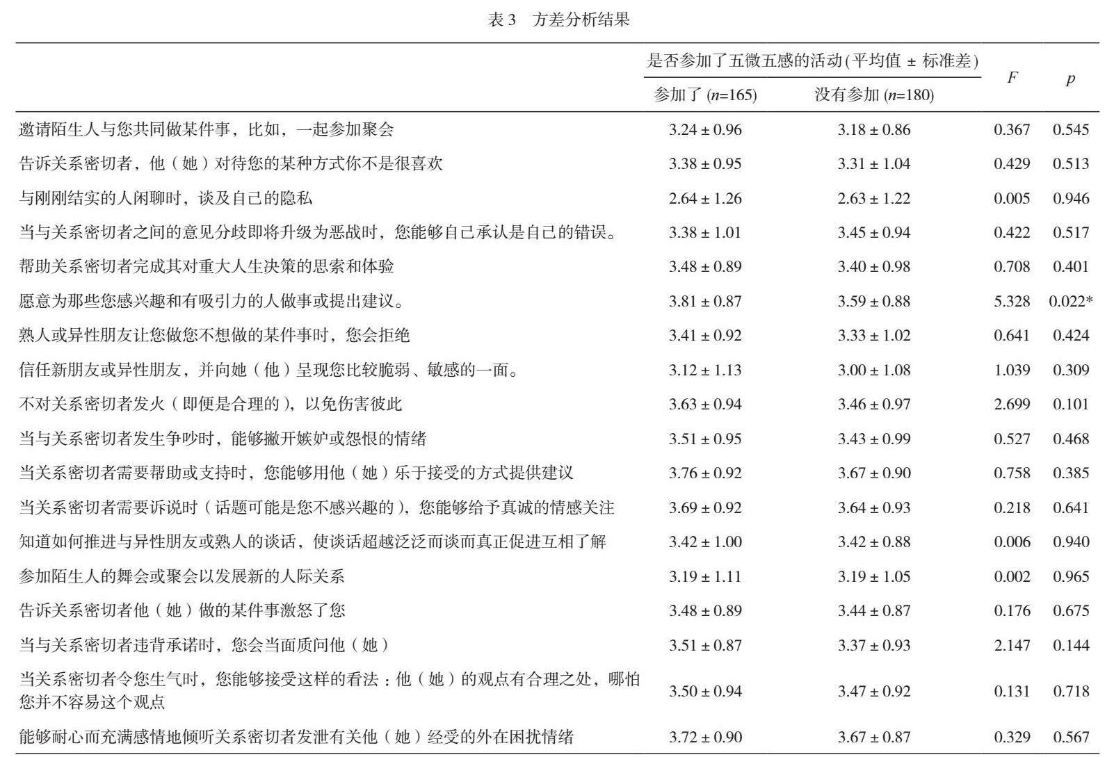 将被参与者的得分与未参与的的得分进行差异性检验,分值如下表3。由表中数据可以看出,是否参加了五微五感的活动样本对于愿意为那些您感兴趣和有吸引力的人做事或提出建议,共1项呈现出显著性(p<0.05),意味着不同是否参加了五微五感的活动样本对于愿意为那些您感兴趣和有吸引力的人做事或提出建议有着差异性。是否参加了五微五感的活动样本对于邀请陌生人与您共同做某件事等39项不会表现出显著性差异。具体分析可知:是否参加了五微五感的活动对于愿意为那些您感兴趣和有吸引力的人做事或提出建议呈现出0.05水平显著性(F=5.328,p=0.022)。以及具体对比差异可知,参加了的平均值(3.81),会明显高于没有参加的平均值(3.59)。说明团体辅导是有实际效果的,但样本数少,导致了实证结果的不完整性。