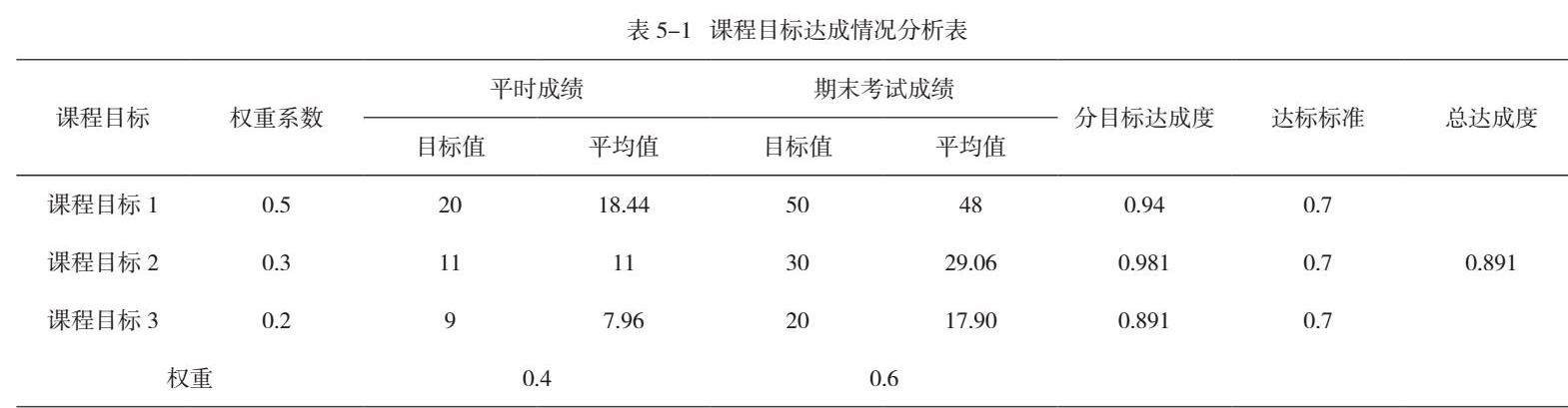 如表5-1所示,课程目标1的权重系数为0.5,期末试卷支持题目共50分,平时成绩20分;课程目标2的权重系数为0.3,期末试卷支持题目共30分,平时成绩11分;课程目标3的权重系数为0.2,期末试卷支持题目共20分,平时成绩9分。