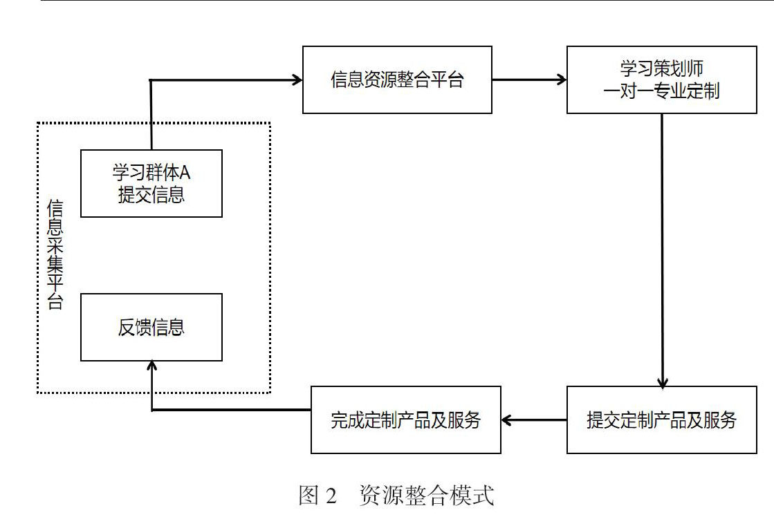 学习群体A浏览礼仪文化学习资源信息,并提交动机与水平问卷,平台进行信息整合和数据分析后,提交给定制学习策划师。策划师针对学习群体A的学习需求,并基于自身的专业判断,全程跟进学习产品的资源配置与整合过程。通过信息资源平台的大数据智能分析进行资源采集和匹配,获得最优资源整合配置以及组合产品方案(见图2)。学习群体A完成定制学习安排设置后,在移动端发布反馈信息;这些评论与建议同时影响学习群体B的定制学习意图与需求。