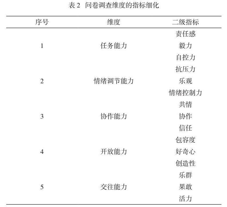 针对目标班级进行问卷调查,问卷设计的维度分为五部分:1任务能力;2.情绪调节能力;3.协作能力;4.开放能力;5.交往能力,每个维度的指标细化情况,如表2所示:
