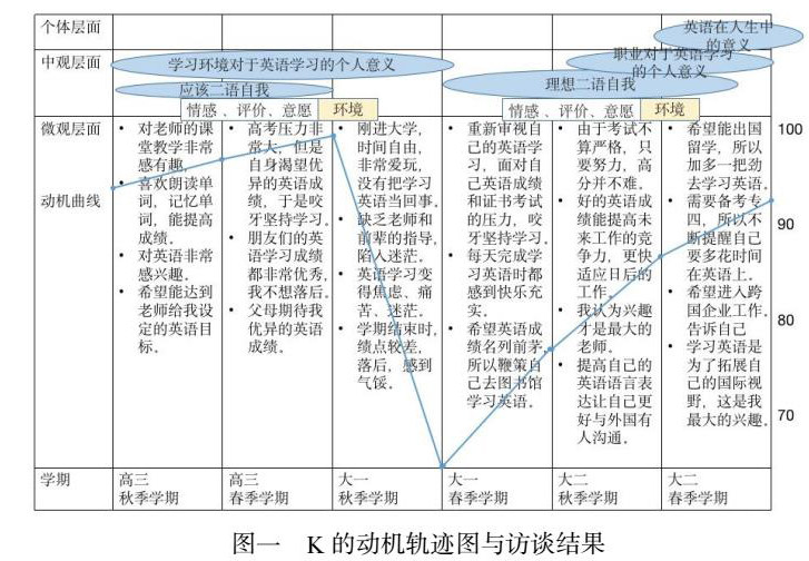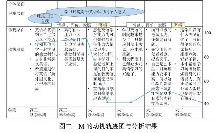 从图一看,K在高三阶段英语学习动机一直处于一个很高的水平,并到达顶峰,进入大一第一学期后动机突然大幅度下降,到达最低点,大一第二学期后缓缓回升,到大二第二学期末(调查结束阶段),动机回到相对的高点,轨迹呈现出非线性波动变化。结合访谈结果可知,在高三阶段,K对学习英语的情感态度是持有积极态度的,他反馈到“英语老师的课堂教学非常有趣(情感、评价),对英语非常感兴趣(情感)。”同时“朋友们的英语学习成绩都非常优秀,自己不想落后(环境、愿景);父母期待自己上好的大学(环境),因此更加渴望优异的英语成绩(愿景)。”由此看得,在多种的因素的共同作用下,使K在高三阶段产生强大的动机流,并使其动机产生强烈的吸态。进入大一后,“不把学习英语当回事,感到迷茫、痛苦、焦虑、气馁(情感)”因此,消极意愿对二语动机水平产生较大的影响。随后,“因各种考试的压力(环境),出国留学的愿望(愿景),提高英语语言表达以便与外国友人更好地沟通、提高未来工作的竞争力、只要愿意努力高分并不难、兴趣才是最大的老师(认知、评价)”等认知的改变,证明K正通过一系列的心理调节去适应新的学习环境,同时也打开了自我激励系统,在新的环境中主动调节二语行为。K多次反复强调“他一直对外语有较高的要求,希望毕业后能在跨国企业工作。”为此从大一下学期后他经常去图书馆自主学习。在最后一次访谈中,他提到“我要努力提高自己的英语成绩,不能像大一那样的颓废。”可见理想二语自我在不断引导K的二语学习行为,同时职业愿景产生强大的推力,在此状态下,K很可能把学习英语作为其人生发展的重要部分。