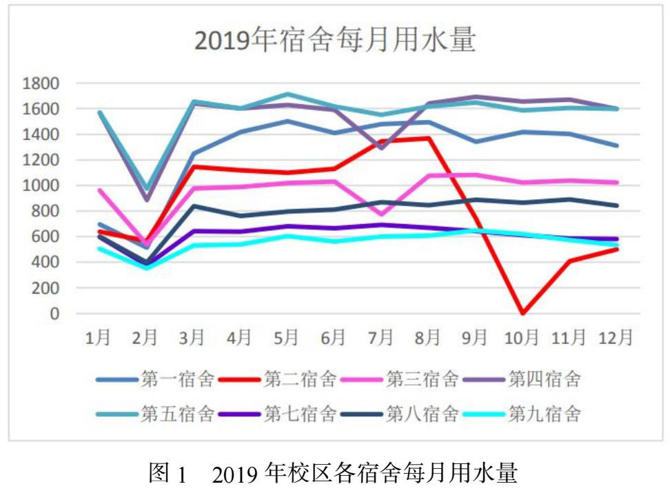 宿舍:通过电子水表的读数,1月到2月,所有学生宿舍用水量都出现下降的拐点,3月用水量呈现上升趋势,研判2月份为寒假,3月份开学,其他月份基本持平,第二学生宿舍8月到10月水表读数呈现直线下降趋势,10月用水量降至为0,11月开始回升,如果排除水表读数不准或损坏的前提条件下,推测第二学生宿舍可能在8月到10月这个时间段,进行了管道维护工作,11月开始逐步正常使用。