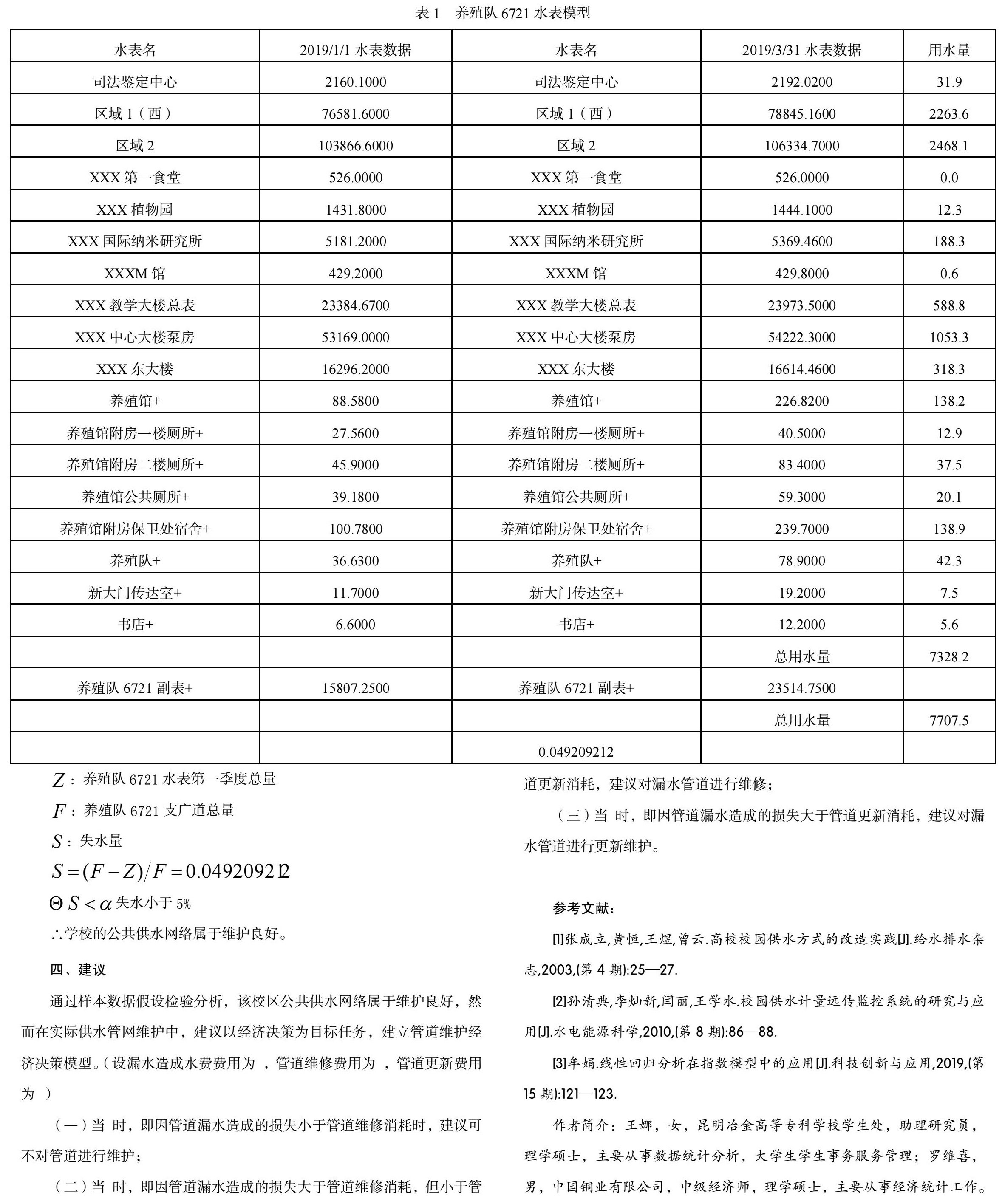 根据资料显示,在维护良好的公共供水网络中,平均失水率在5%左右,而在比较老旧的管网中,失水则会更多。我们预先设定的学校管网失水率为1%;当检验假设为真,但被验证错误的拒绝的概率,记作 ,取 =0.1。样本选取有多支管道的养殖队6721水表建立模型如下: