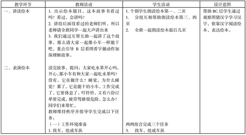 本案例的教学设计共四部分:讲读绘本,表演绘本,我的绘本,感悟绘本。每个环节都是根据特校学生特性设计,不同的绘本或不同的课时都可固定这四个环节推进,具有一定程度可复制性。