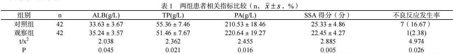 对两组患者护理后的营养情况,采用全自动生化分析仪进行检测,检测内容包括血清白蛋白(ALB)、总蛋白(TP)、前清蛋白(PA)水平。采用吞咽功能评估表(SSA)对患者的尊严功能进行评估,分数最高46分,分数越低表明患者吞咽功能越好。记录患者的不良反应情况,不良反应主要包括返流、误吸、腹泻和腹胀。