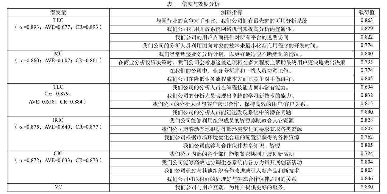 基于信度和效度的考虑,本文提出的每个潜变量的度量指标均以国内外相对成熟的量表题项为基础,并结合平台企业的特征对问卷内容进行细微调整,最终形成测量量表,各变量的具体题项如表1所示。其中大数据分析能力采用Wamba等(2017)[2]和Yasmin等(2020)[11]的研究量表,动态创新能力参考Hertog(2010)[22]、Janssen等(2015)[6]和董保宝(2012)[23]的研究成果;价值共创采用Chuang和Lin(2015)[25]的研究量表,共设置4个题项。结合已有相关研究,本研究对可能影响平台企业价值共创的变量进行了控制,包括企业规模、企业年限和企业类型。问卷测度项采用李克特五级量表设计,1表示“非常不符合”,5表示“非常符合”。