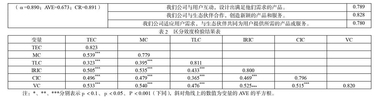 在问卷设计阶段,对共同方法偏差问题进行事前控制,进行多源数据收集。其次,运用Harmans单因子检测方法对所有潜变量进行探索性因子分析,未旋转情况下获得因子方差解释率,第一个主成分解释总方差是38.21%,小于临界值40%,可初步验证不存在明显的共同方法偏差问题。考虑上述方法存在一定的局限性,本研究运用验证性因子分析模型,进一步检验共同方法偏差问题。结果可知六因子模型的拟合度(χ2/df=1.005,RMSEA=0.004,SRMR=0.032,CFI=1.000,TLI=1.000)优于加入单一方法潜因子之后的模型拟合度(χ2/df=1.020,RMSEA=0.008,SRMR=0.034,CFI=0.999,TLI=0.999),表明本研究不存在明显的同源误差。