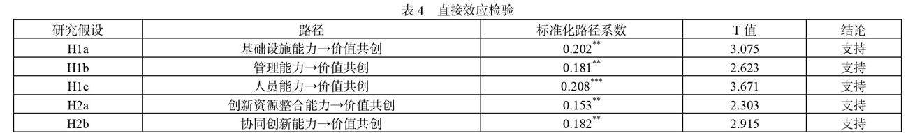 表4给出了各潜变量之间的标准化路径系数以及对应t值。由表4可以看出,全体假设均通过了T检验,路径系数在置信度α=0.05的水平上都显著。根据检验结果可知,假设H1、H2成立。与此同时,控制变量企业年限、企业规模和企业类型对价值共创的影响均不显著。